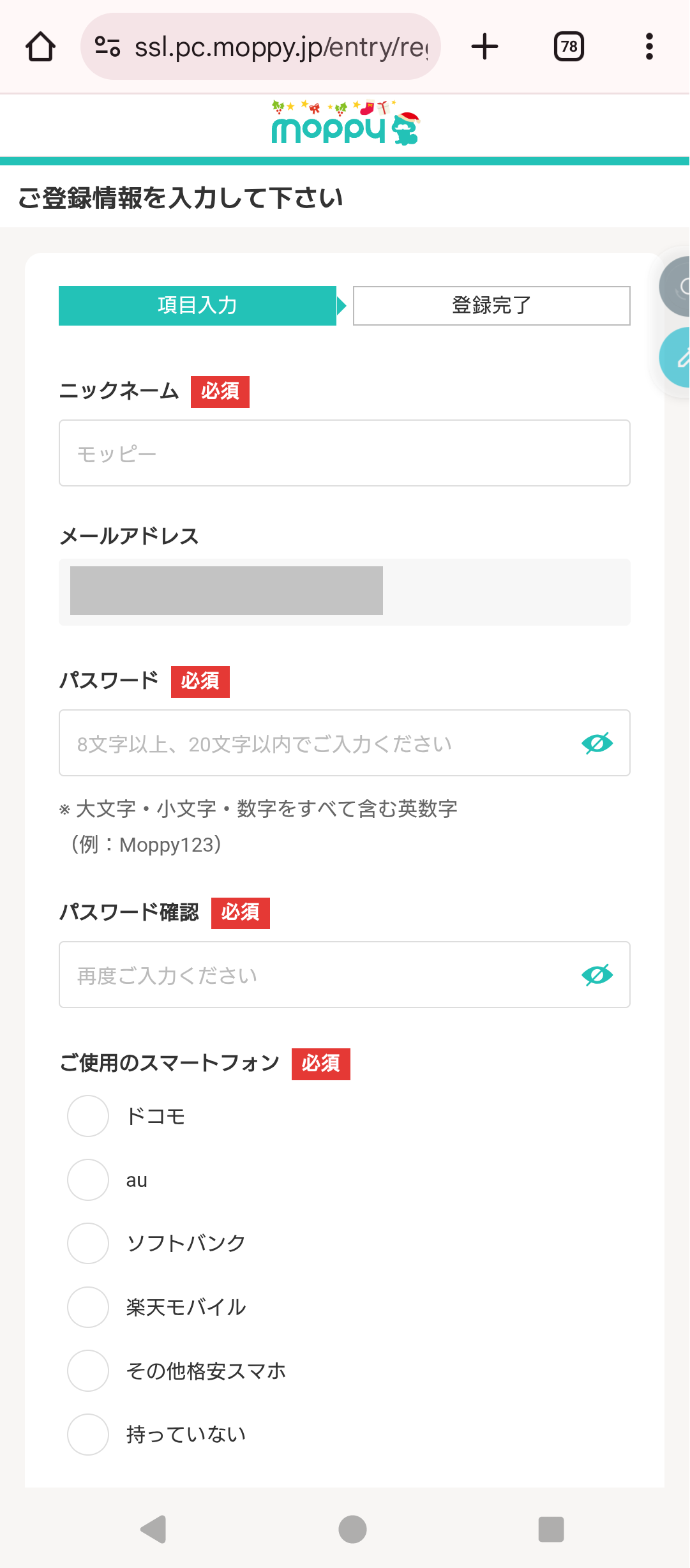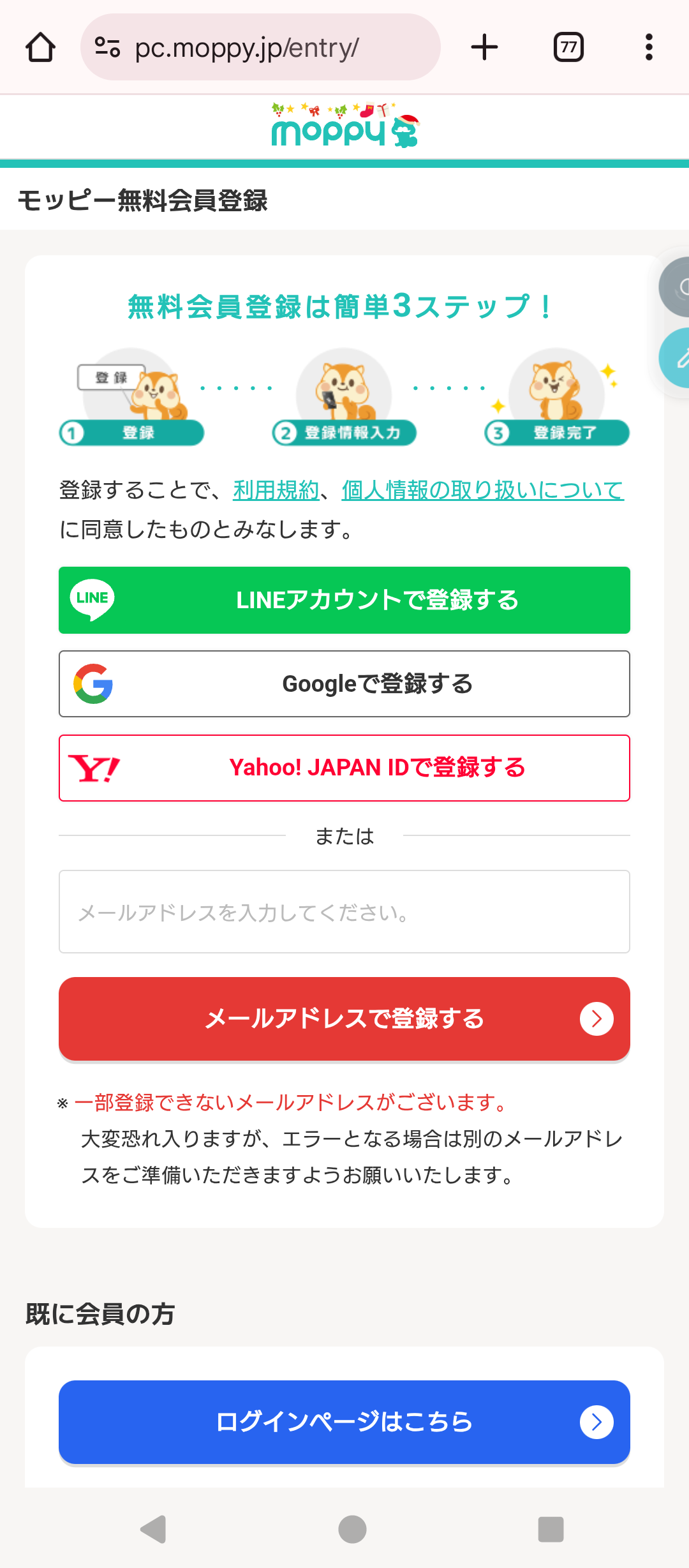 まずはモッピーのアカウントを作ります。メールアドレスがあれば1分で完了します。