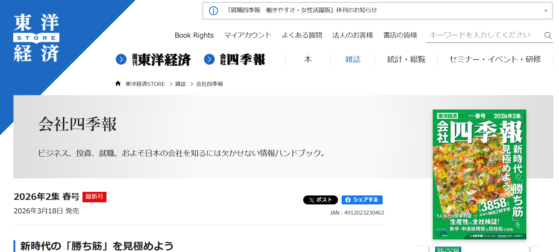 「四季報」という名前の通り、季節ごとに年に4回(春号、夏号、秋号、新春号)発売されます。